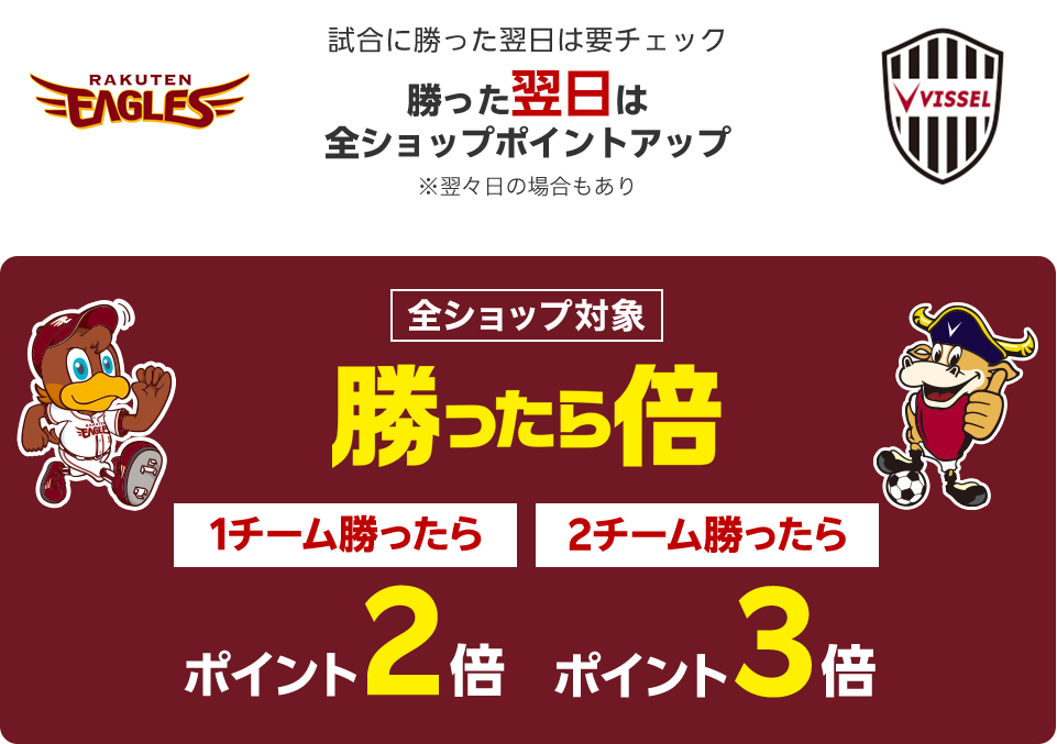 ※ヴィッセル神戸 応援ありがとうキャンペーン「エントリー&3,000円(税込)以上お買い上げで300万ポイント山分けチャンス!」と「抽選でグッズが当たる!」は3,000円(税込)以上のお買い物で、同時にご応募いただけます。