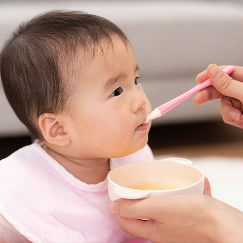 離乳食で卵を与える際は、アレルギーのリスクが低い卵黄から始め、卵白、全卵へとステップアップしていきます。初めて食べさせるときは、アレルギーを発症することを想定して、平日の午前中に与えるようにしましょう。