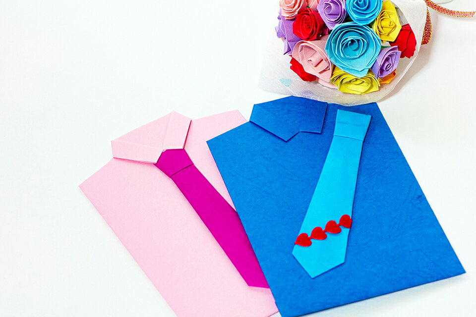 折り紙でYシャツをたたんだ形やネクタイの形が作れます。それぞれ別折りの方法もありますし、1枚でシャツにネクタイが結ばれた形を折ることもできます。