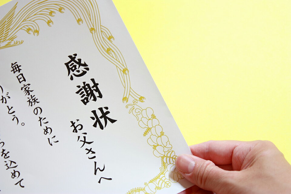 メッセージカードを「感謝状」風に作る方法もおすすめです。筆文字で、お父さんに普段の感謝の気持ちを伝えましょう。最後に四角い印を押すと、より本格的に仕上がります。