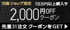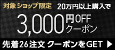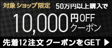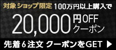 対象ショップで使える、 【先着5注文限定】1,500,000円(税込)以上の購入で使える30,000円OFFクーポン 【先着6注文限定】1,000,000円(税込)以上の購入で使える20,000円OFFクーポン 【先着12注文限定】500,000円(税込)以上の購入で使える10,000円OFFクーポン 【先着26注文限定】200,000円(税込)以上の購入で使える3,000円OFFクーポン 【先着31注文限定】100,000円(税込)以上の購入で使える2,000円OFFクーポン をプレゼントいたします。 |