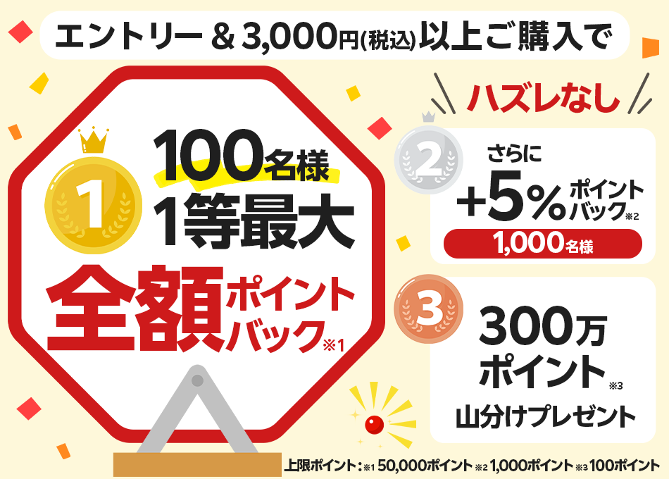 ※1等、2等の特典ポイントは税抜、送料別、クーポン適用後の金額に対して付与されます。